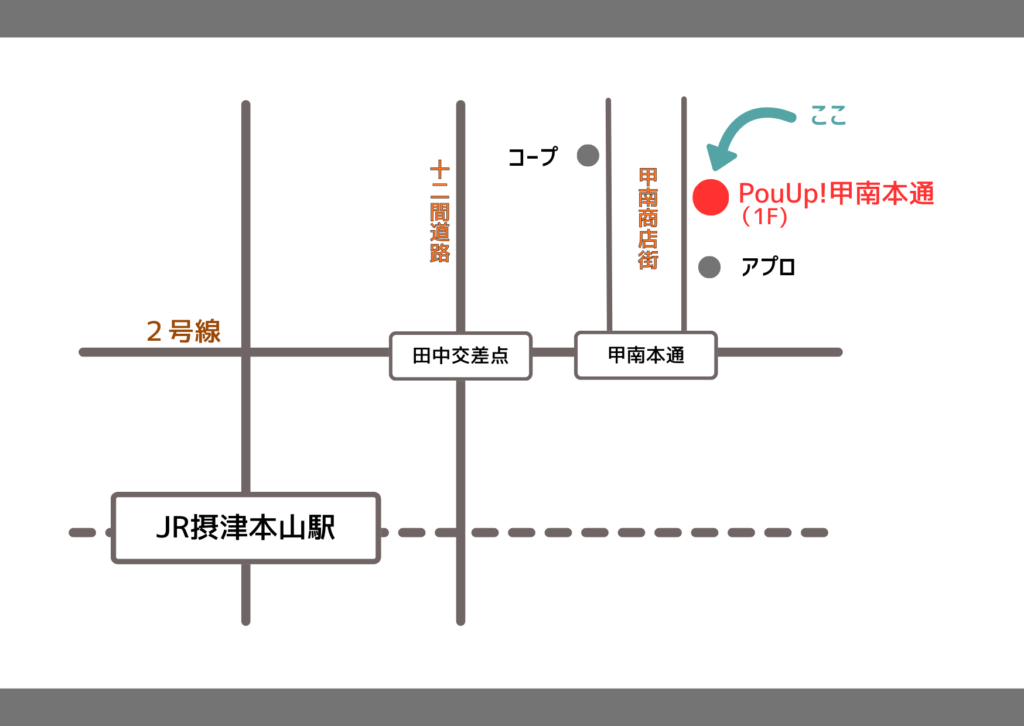 - 商店街の中ほど、コープの少し手前にある「Pop Up!甲南本通」が会場です